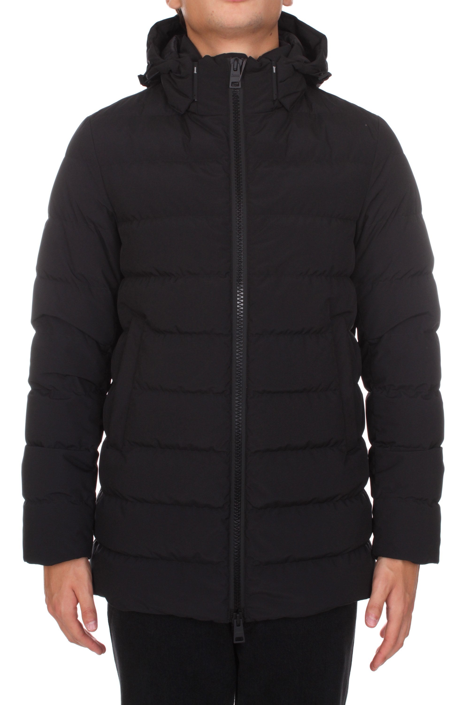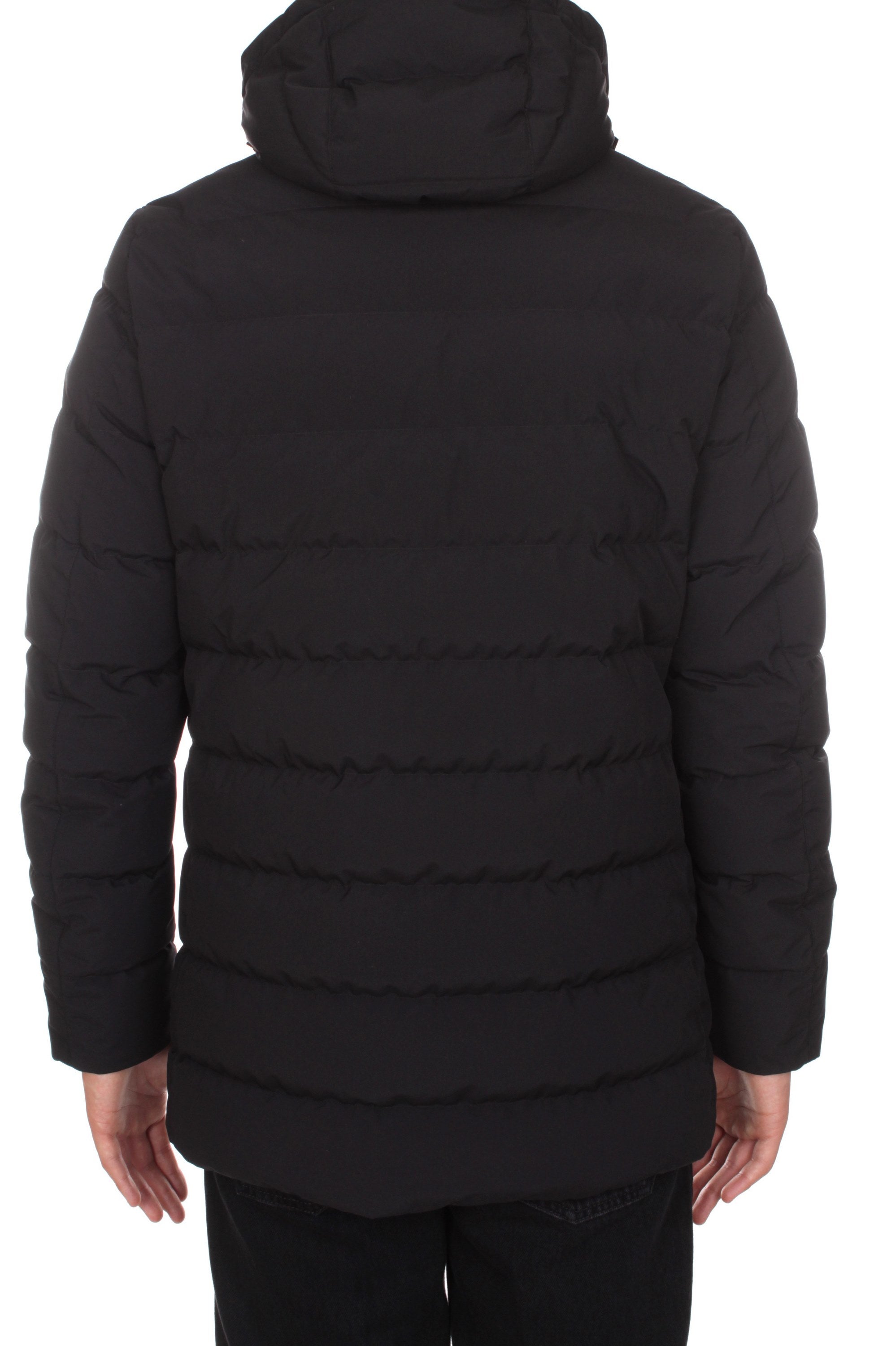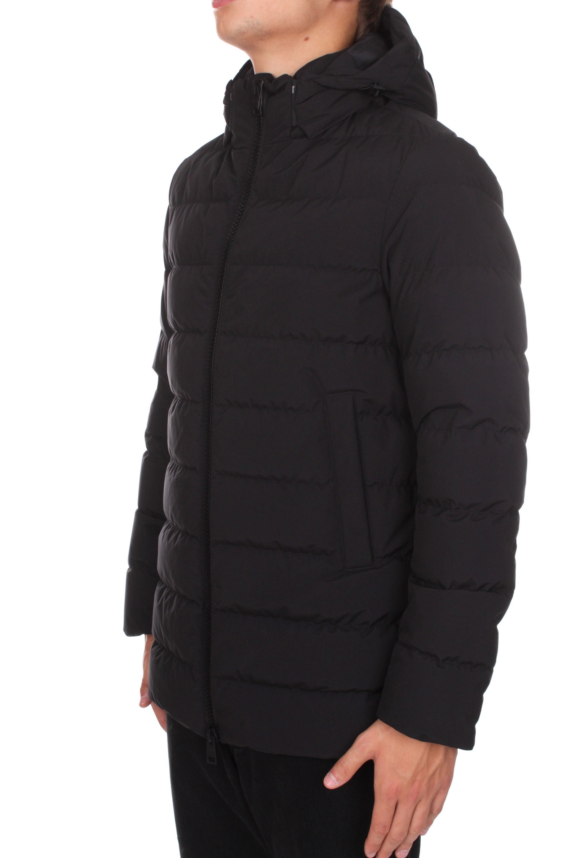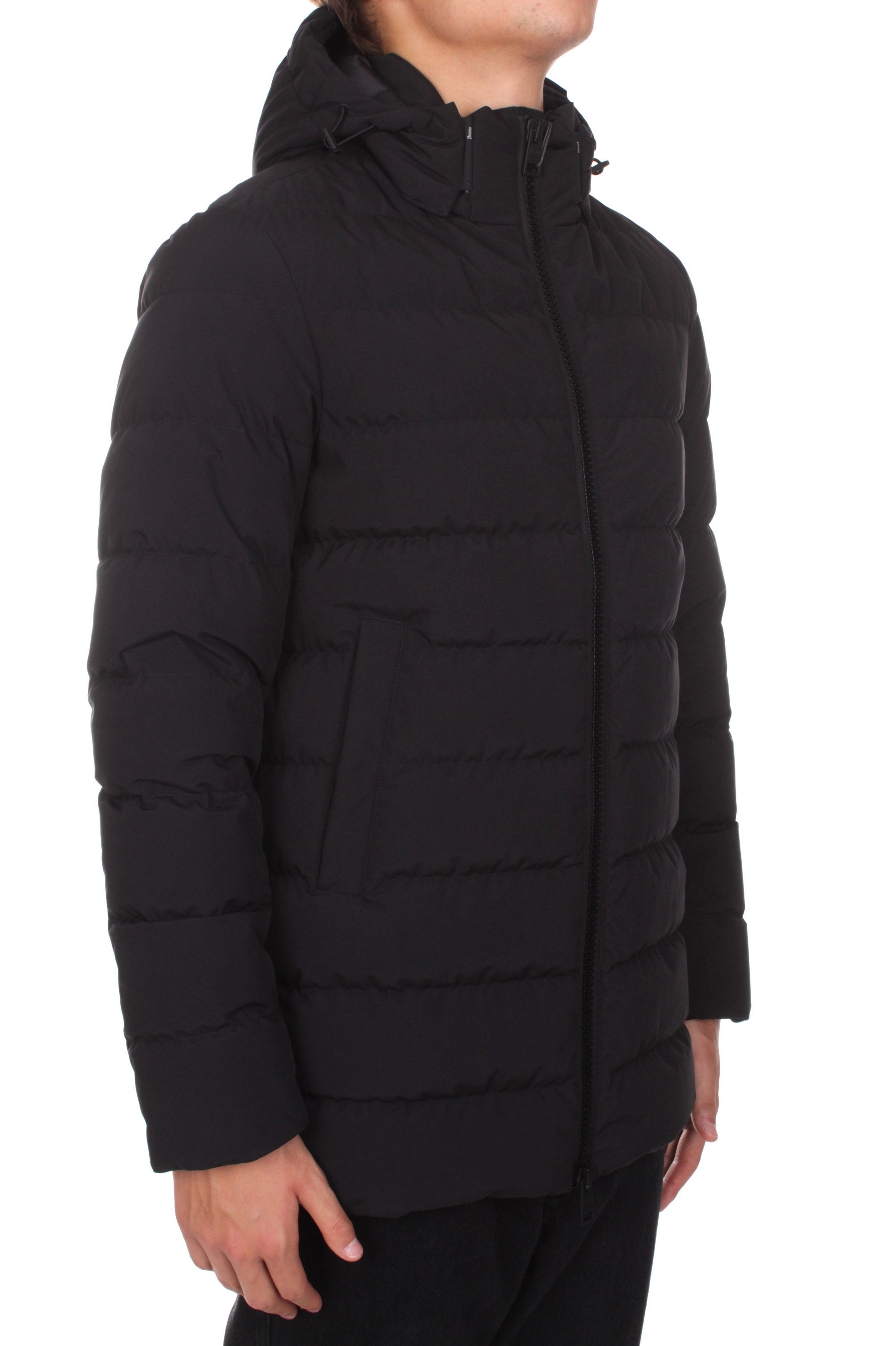 Herno down jacket is made of 100% polyester with Pro-Meteo technology and features goose down insulation, double slider zip closure, two side pockets with snap button closure and detachable hood. Regular fit. Model is 180 cm tall and wears size 48.