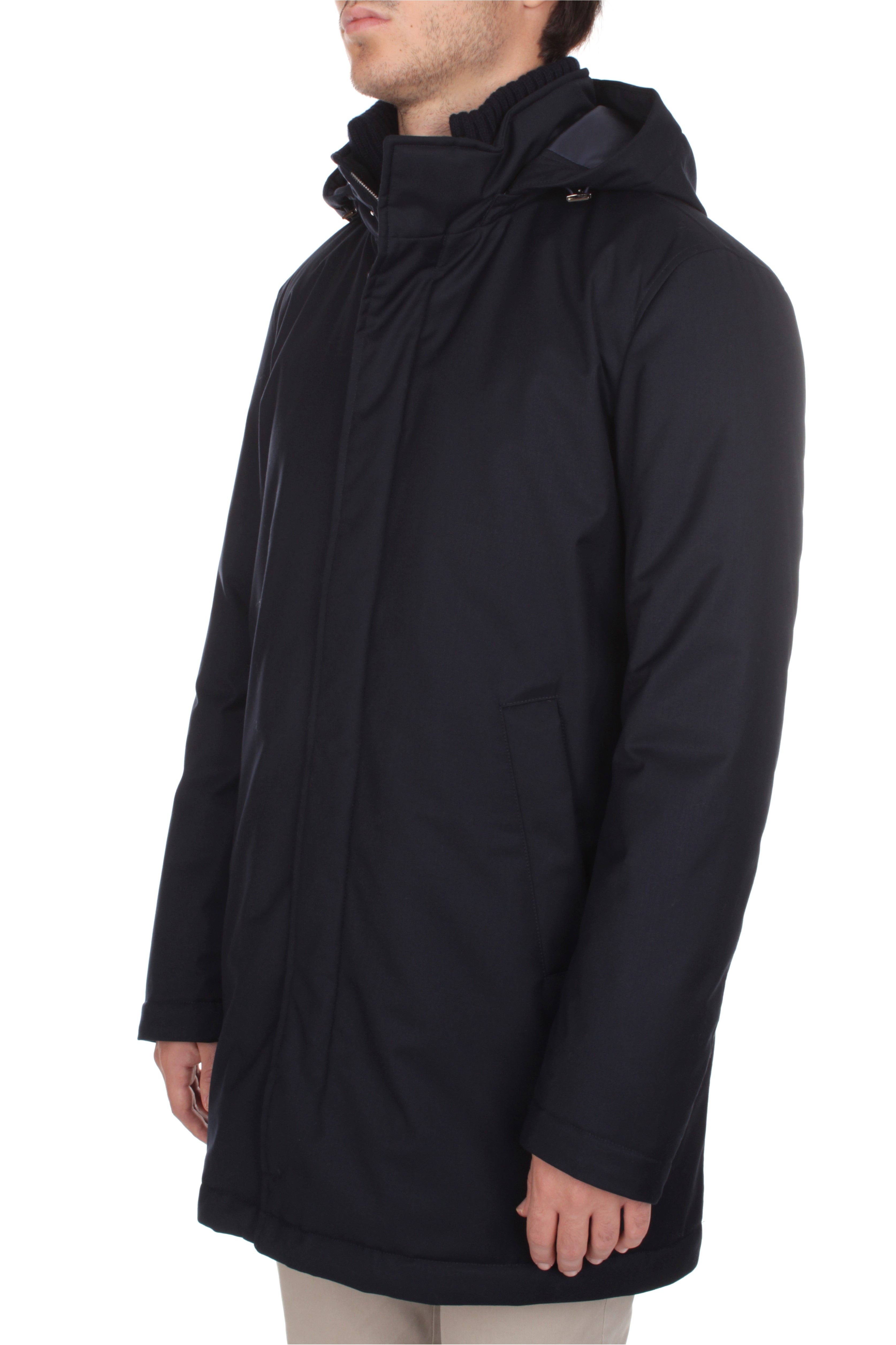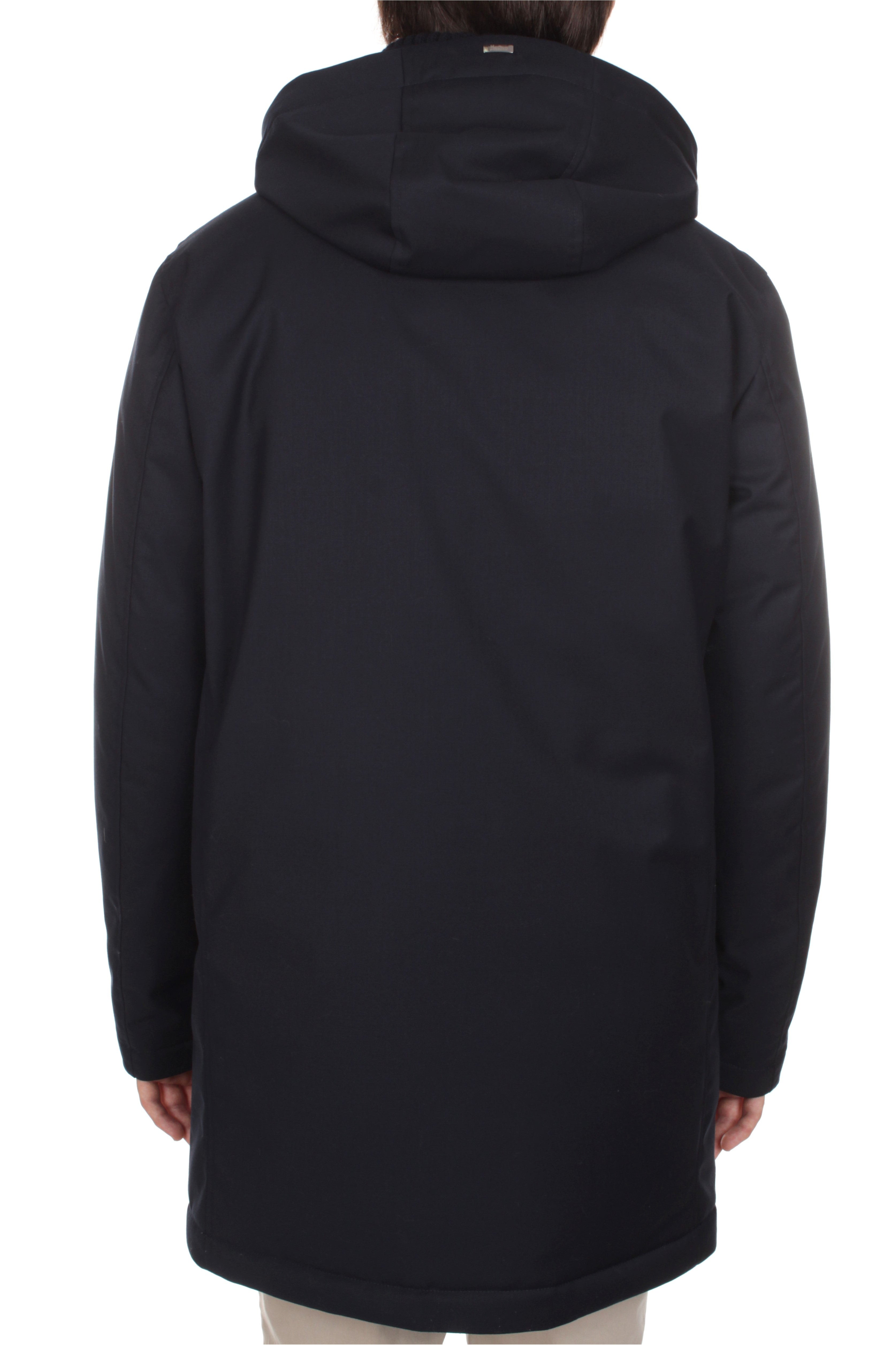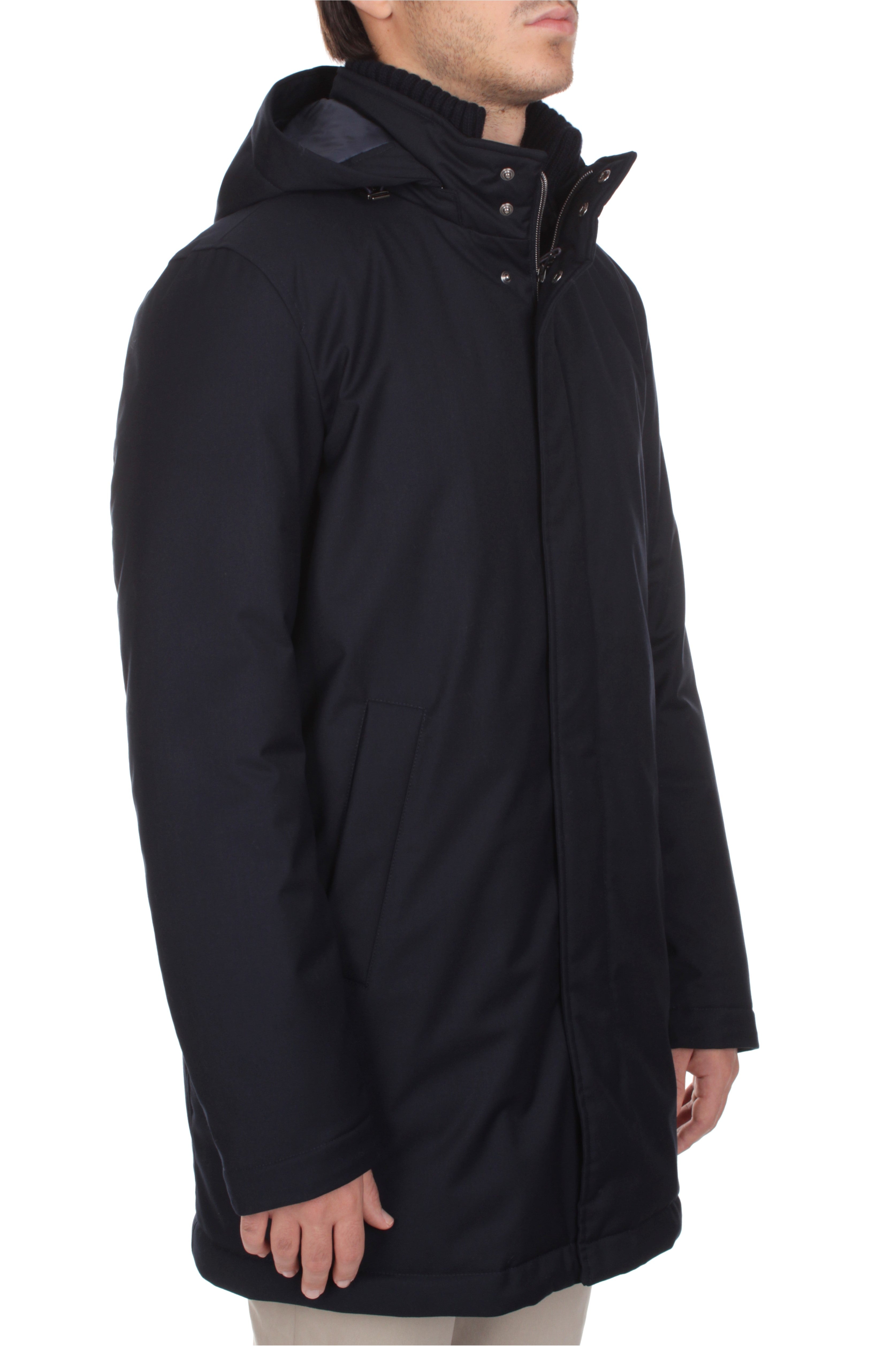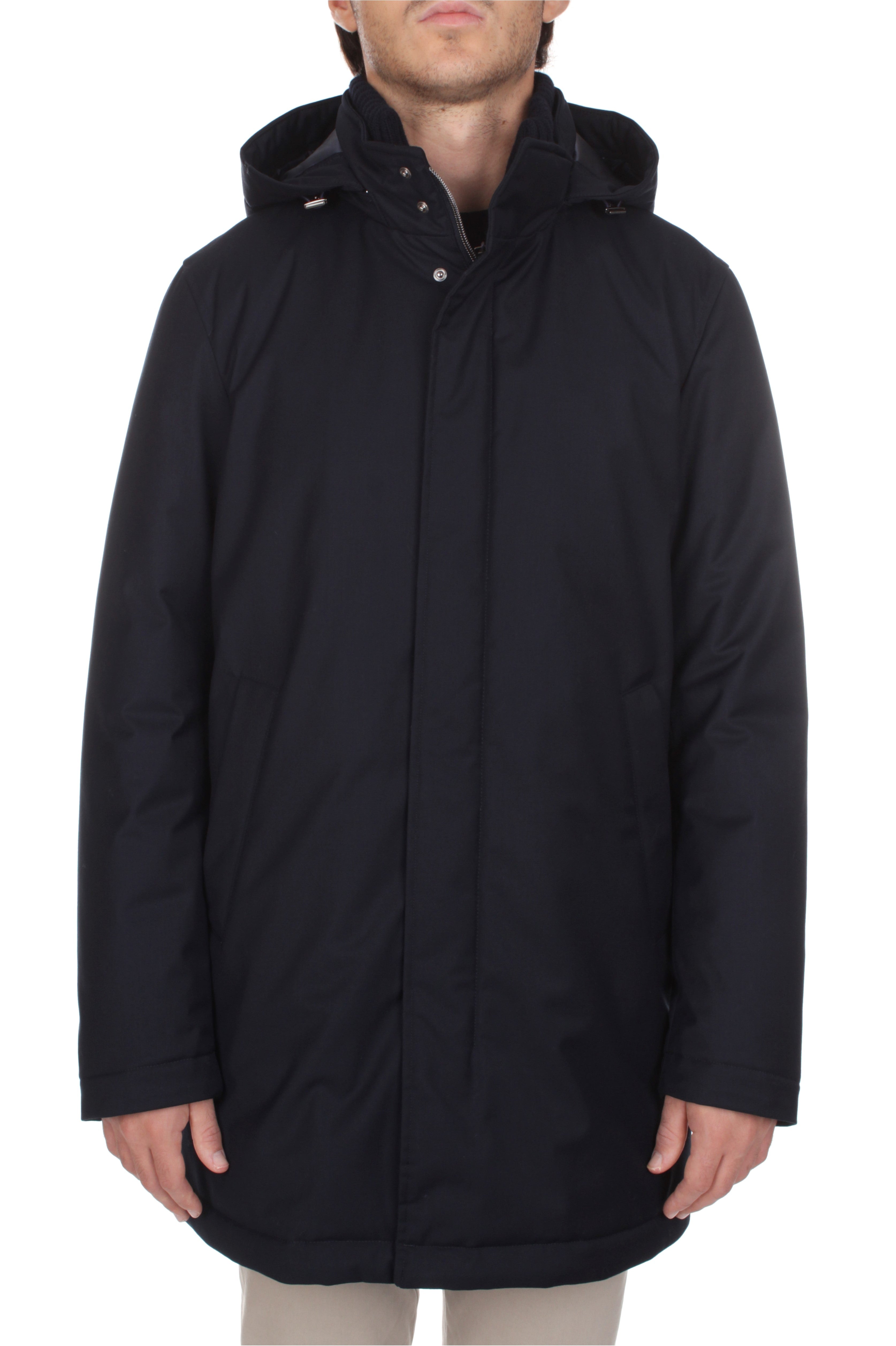 Herno jacket is made of 80% polyester and 20% viscosa and features polyester insulation, double slider zip and snap button closure, two side welt pockets with snap button closure, knit collar and detachable hood. Regular fit. Model is 180 cm tall and wears size 48.