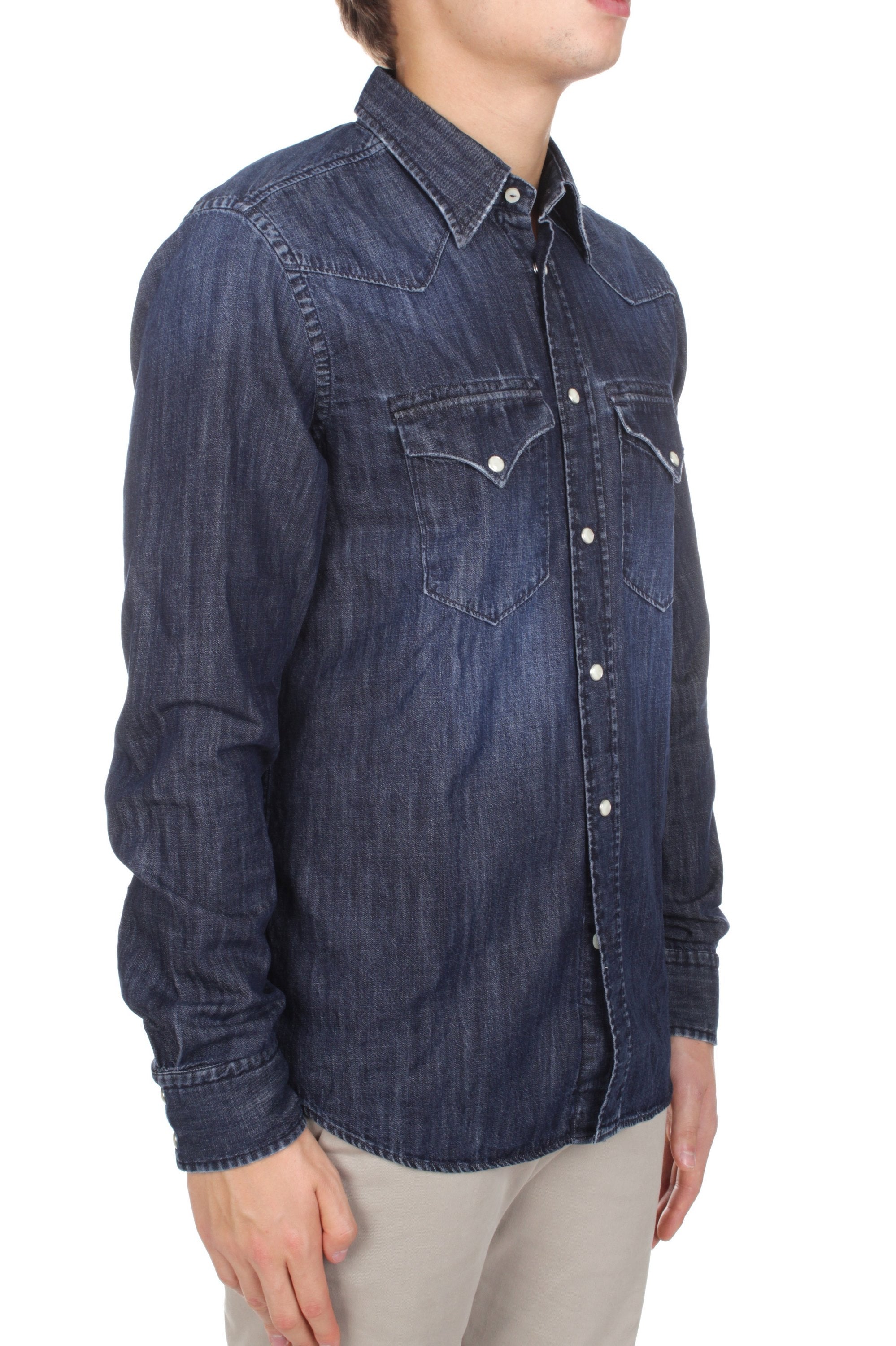 Mastricamiciai blue denim shirt redefines casual elegance through Italian tailoring excellence. Crafted from 100% cotton, it features a soft, durable texture and a refined dark-wash finish that enhances its authentic character. The Western-inspired design, with two flap chest pockets and snap buttons, is balanced by a slim, modern fit that highlights the silhouette without sacrificing comfort. Versatile and timeless, this denim shirt transitions effortlessly from casual days to refined urban looks. A true expression of Italian craftsmanship and understated sophistication.