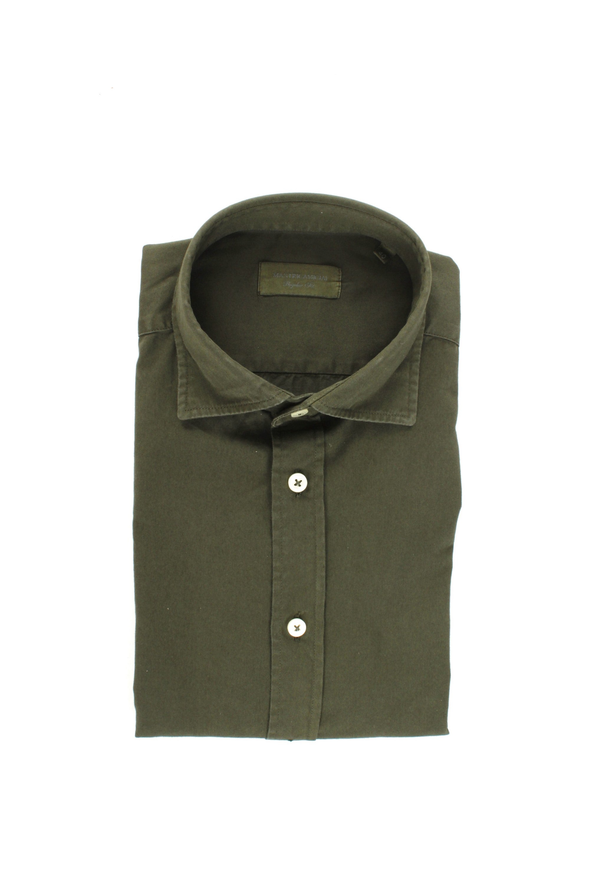 Mastricamiciai military green shirt with spread collar blends casual character with refined contemporary style. Crafted from 100% cotton, it features a soft, lightweight texture ideal for everyday wear or relaxed elegance. The spread collar enhances the structured silhouette, balancing the rich green tone with a touch of sophistication. With its regular fit, it delivers both comfort and personality.