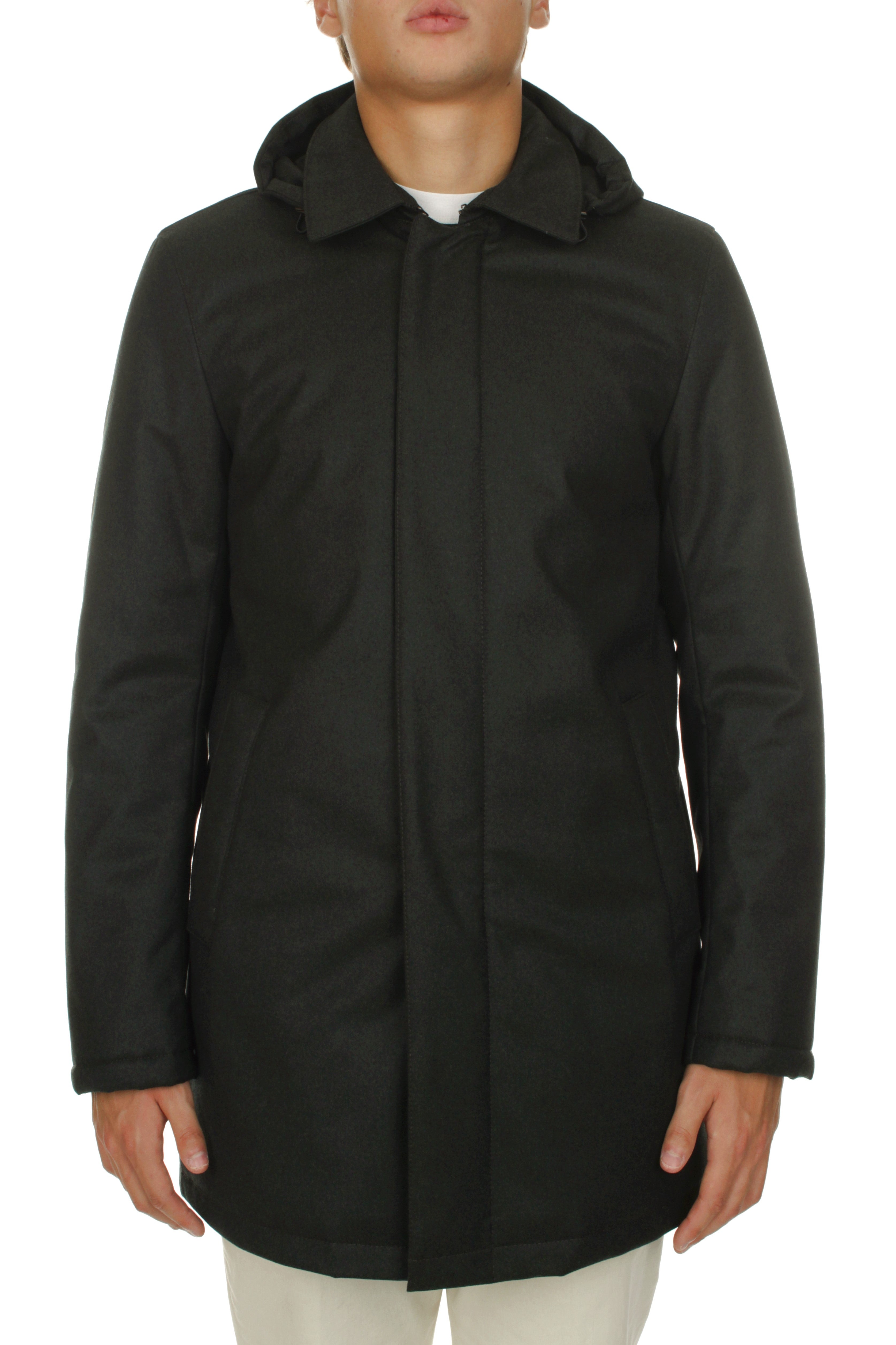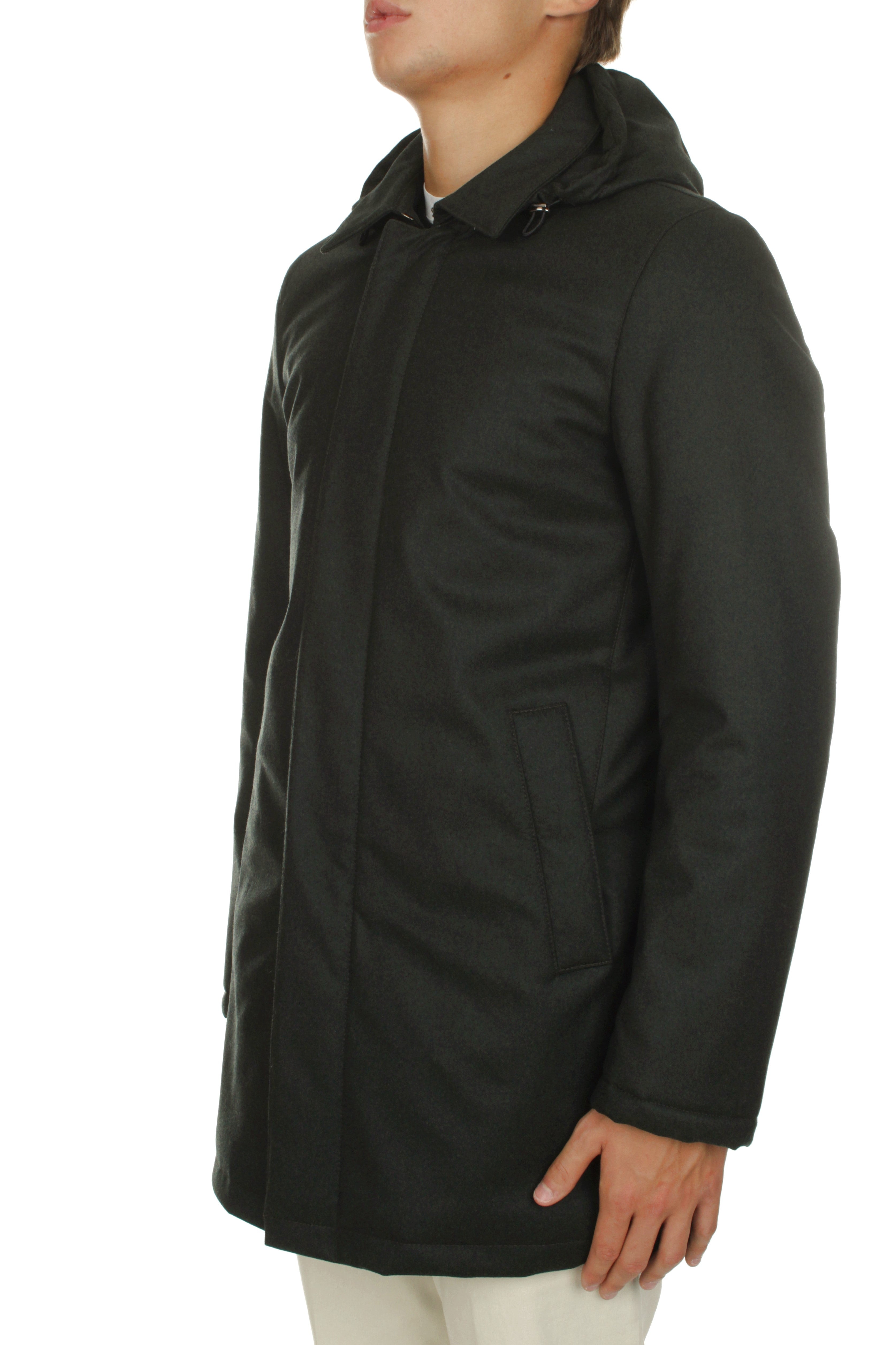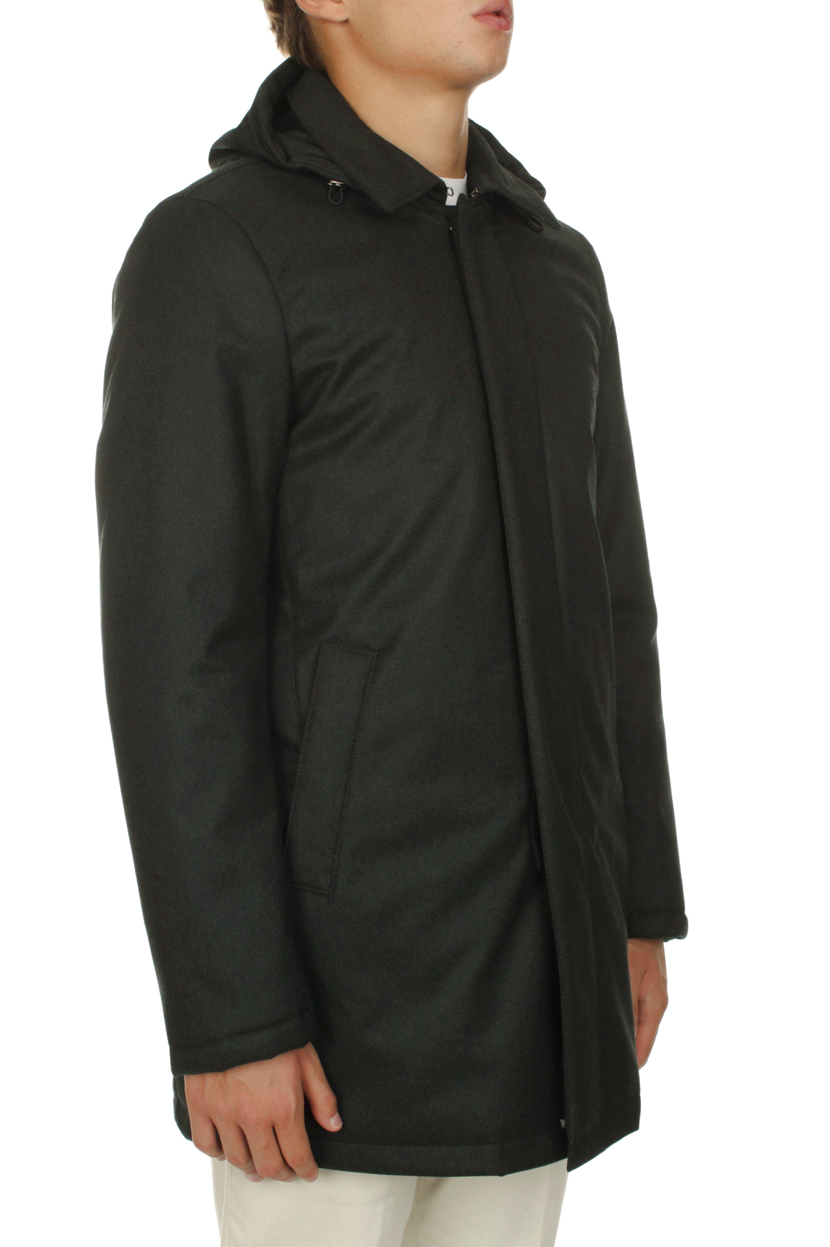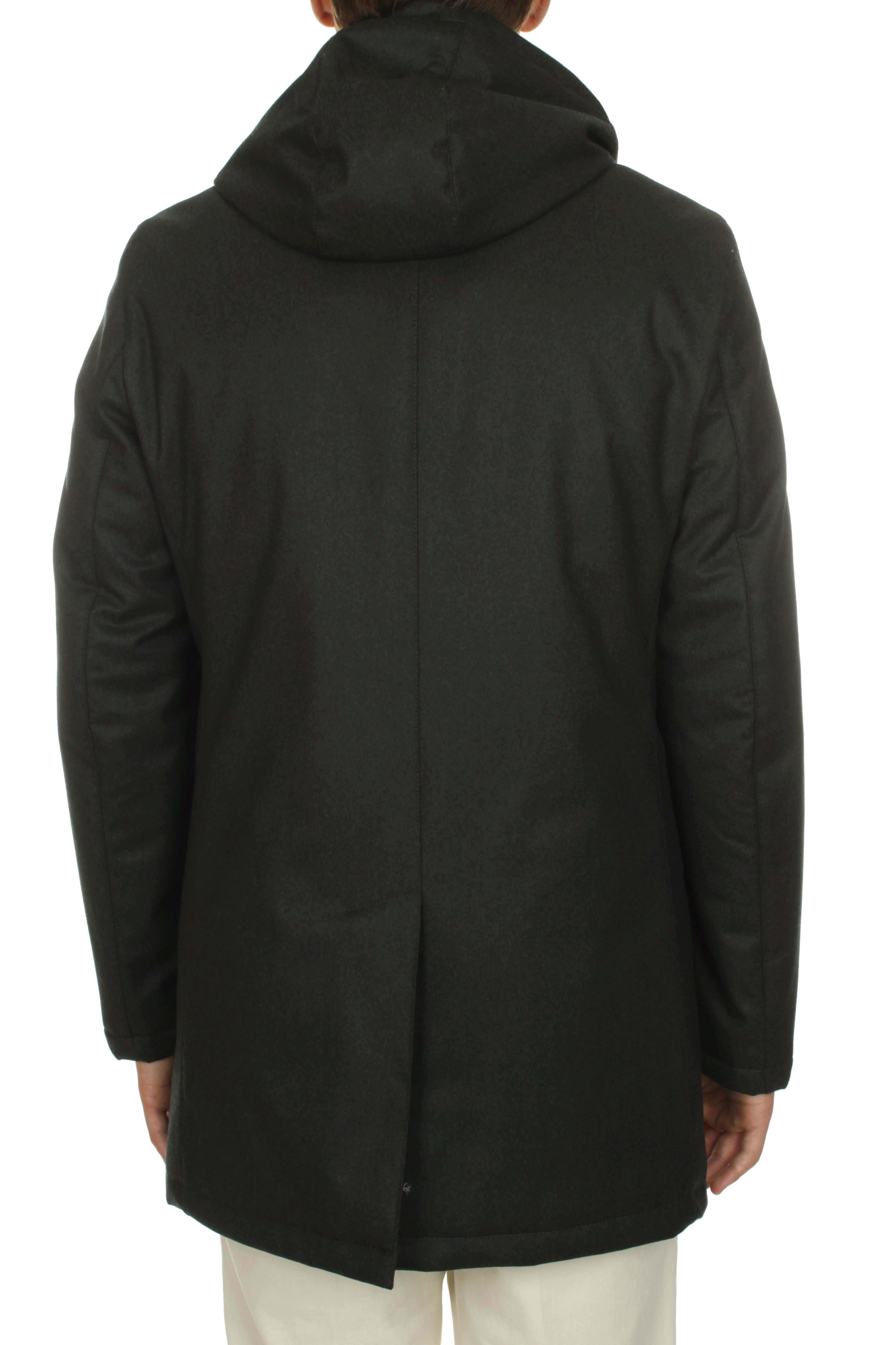 Michi D’Amato Marvin down jacket is made of 93% virgin wool Vitale Barberis Canonico fabric and 7% polyurethane and features polyester insulation, double slider zip and snap button closure, two side welt pockets with snap button closure and detachable hood. Regular fit. Model is 180 cm tall and wears size 48. Made in Italy.