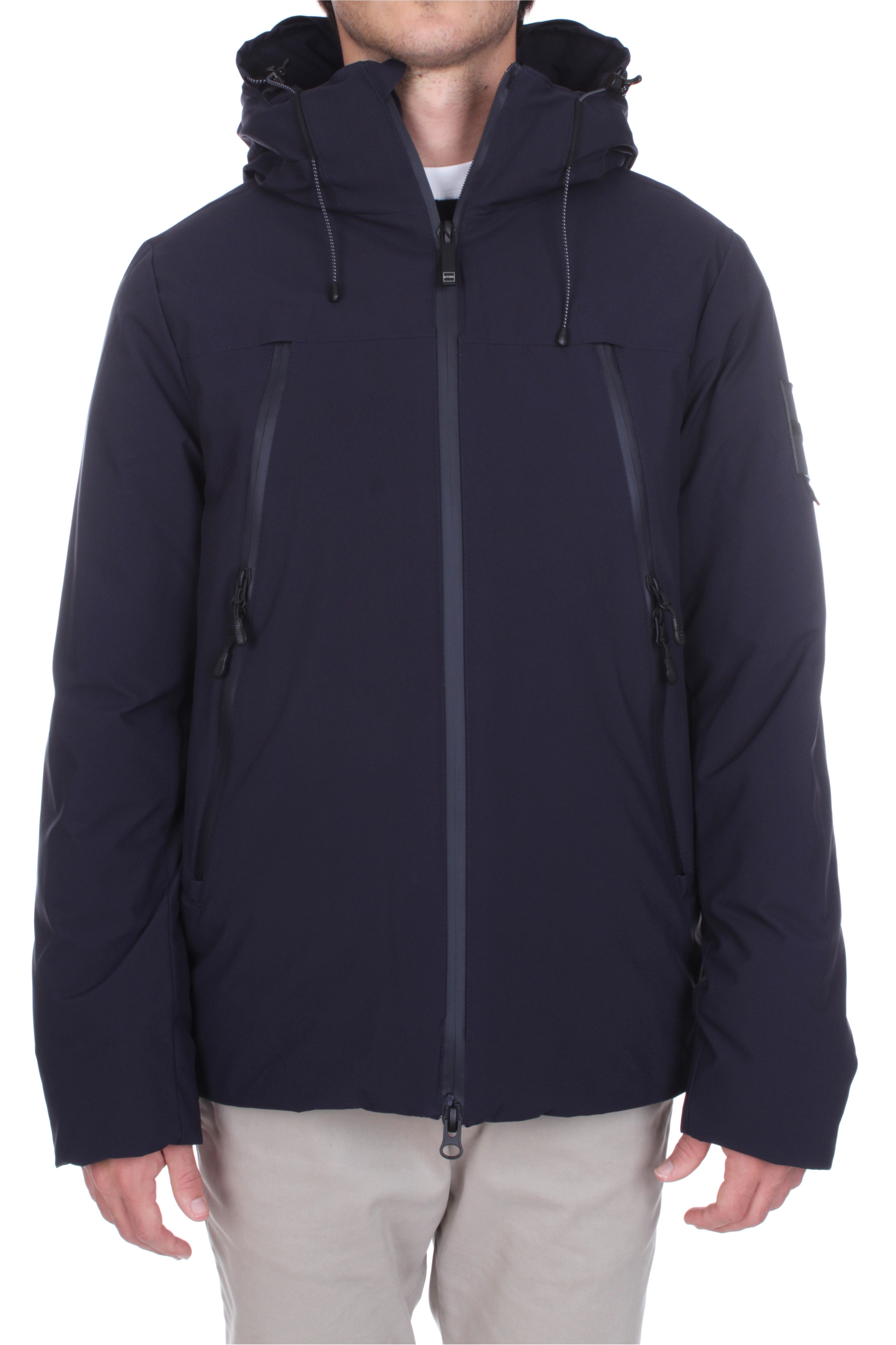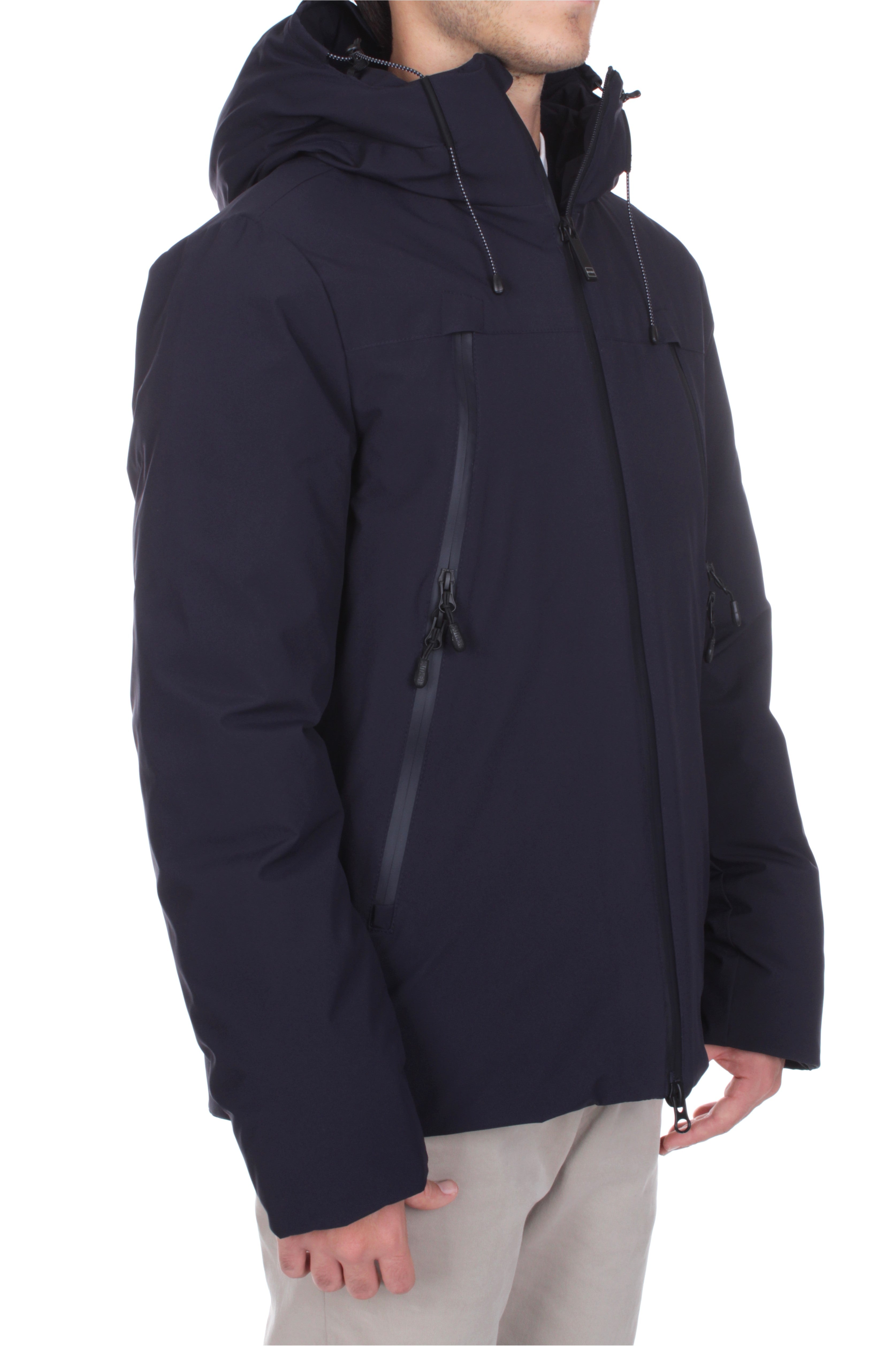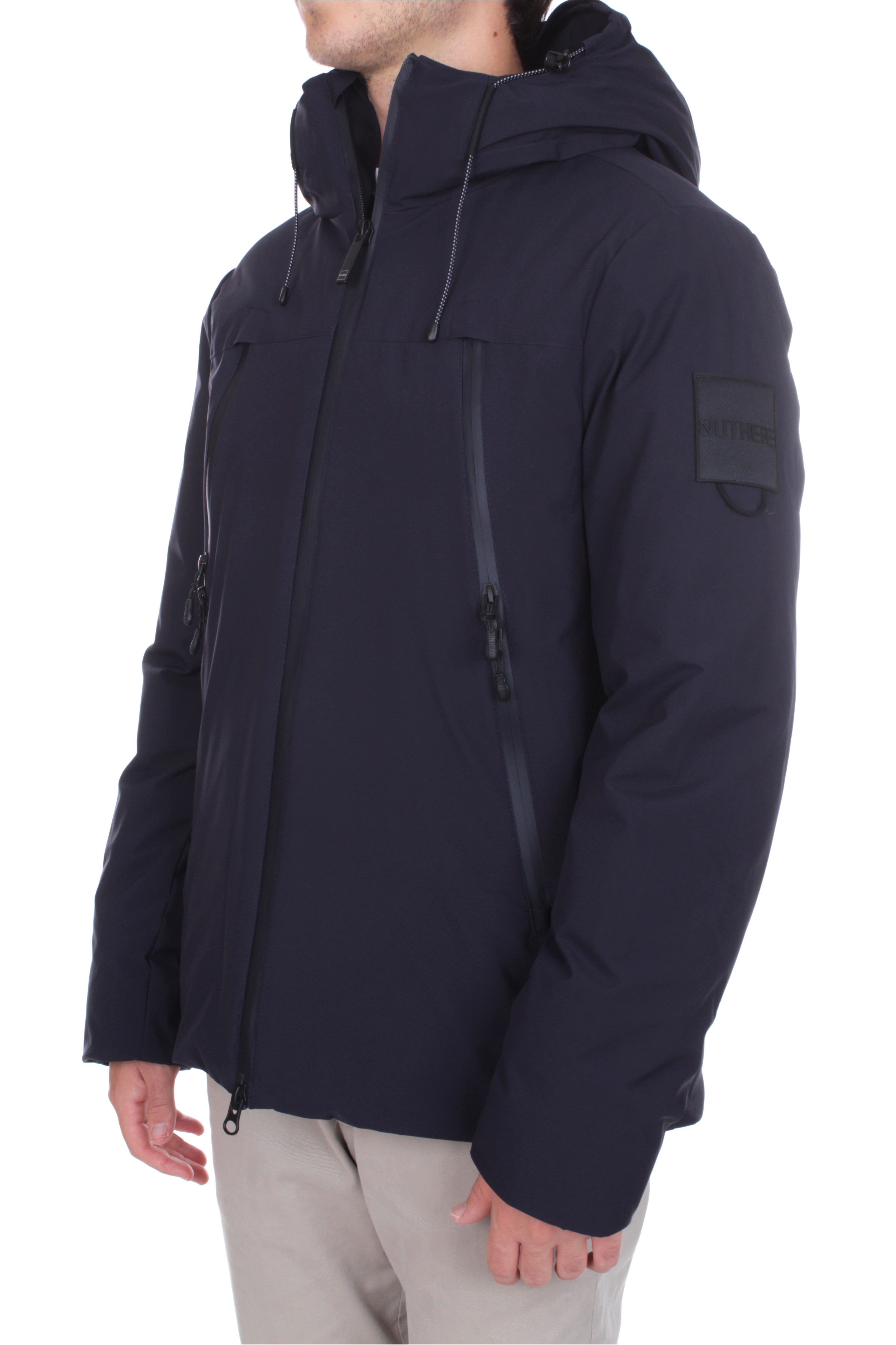 The Outhere Cinquecento hooded down jacket in blue nighttime blends modern design with technical warmth. Crafted from 100% polyester with down padding, it features a two-way zip, four functional pockets including chest hand warmers, and the Outhere logo patch on the sleeve. Regular fit. Model is 180 cm tall and wears size M.