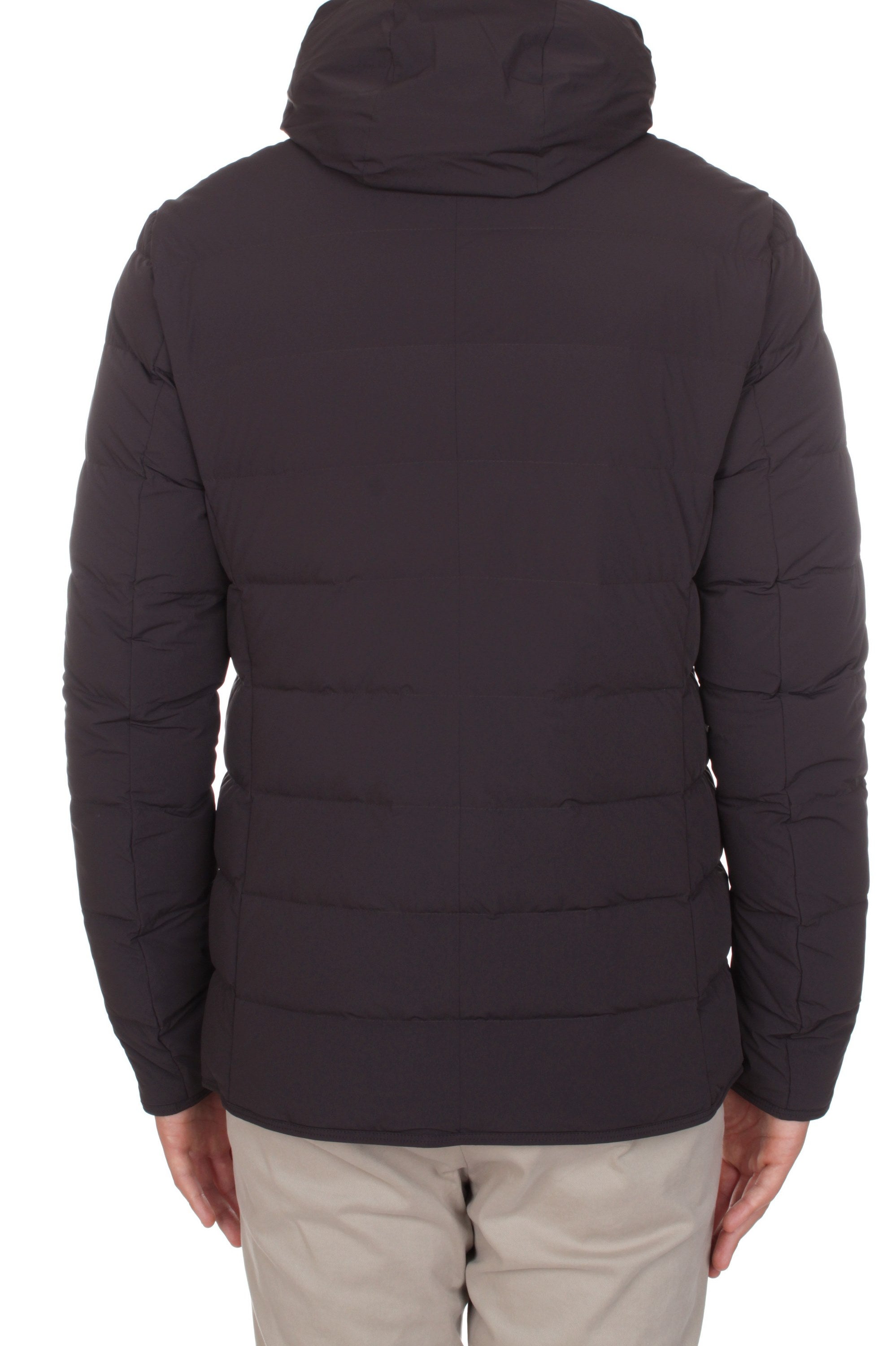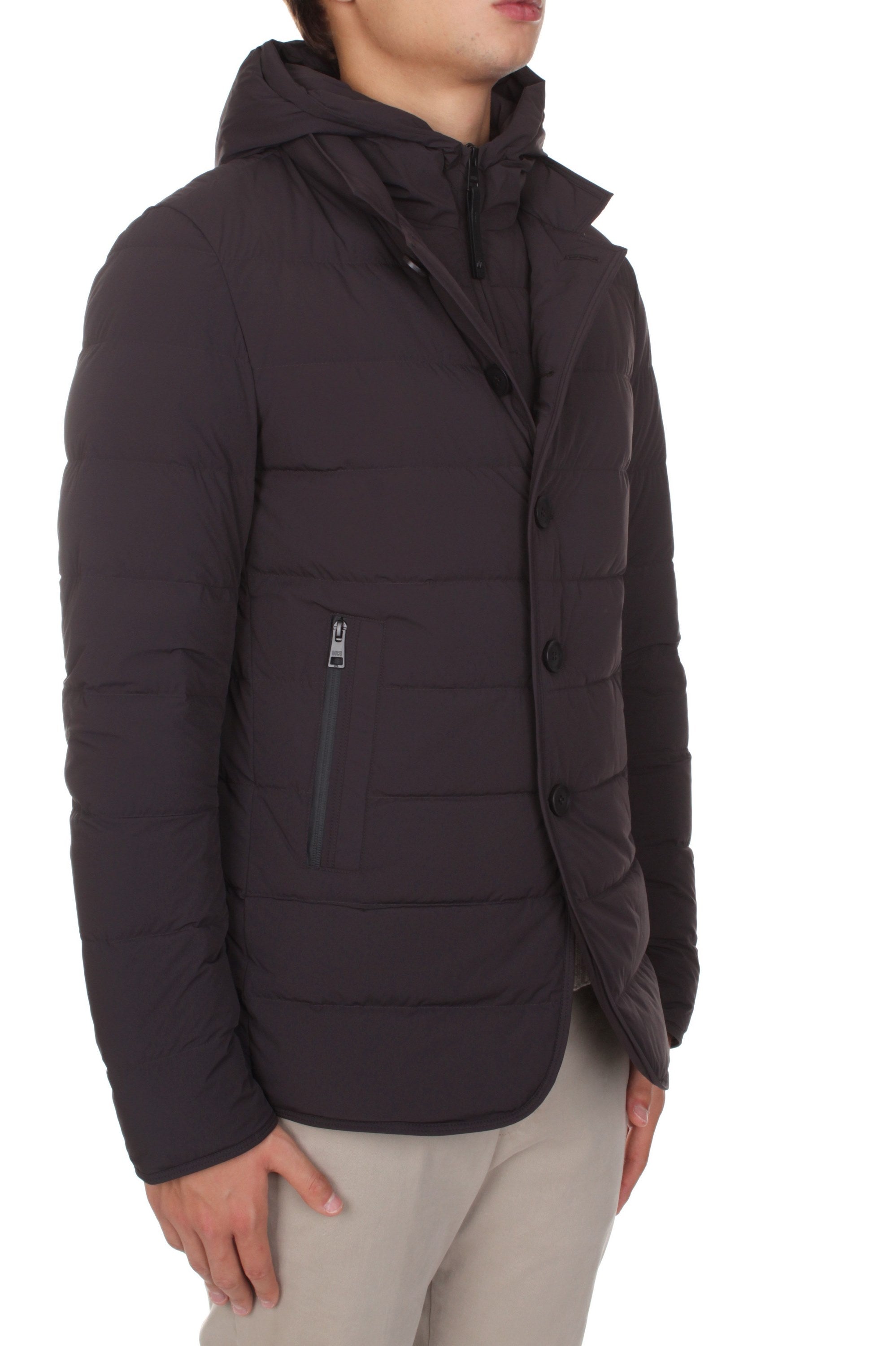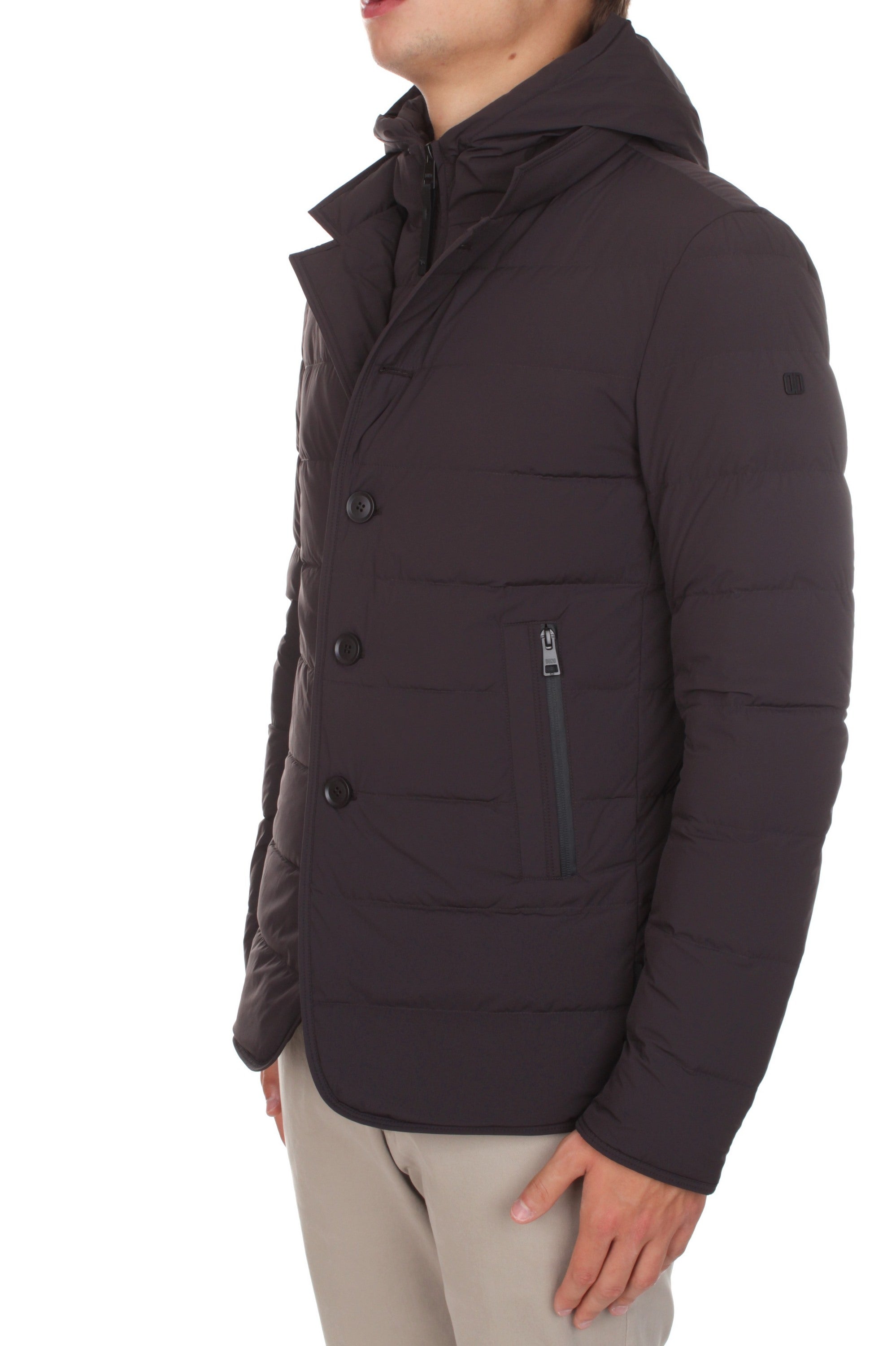 Duno Master down jacket is made of 80% polyamide and 20% elastane and features duck down insulation, detachable hoodie vest, button closure, two side pockets with zip closure and brand logo patch on the left sleeve. Slim fit. Model is 180 cm tall and wears size 48.