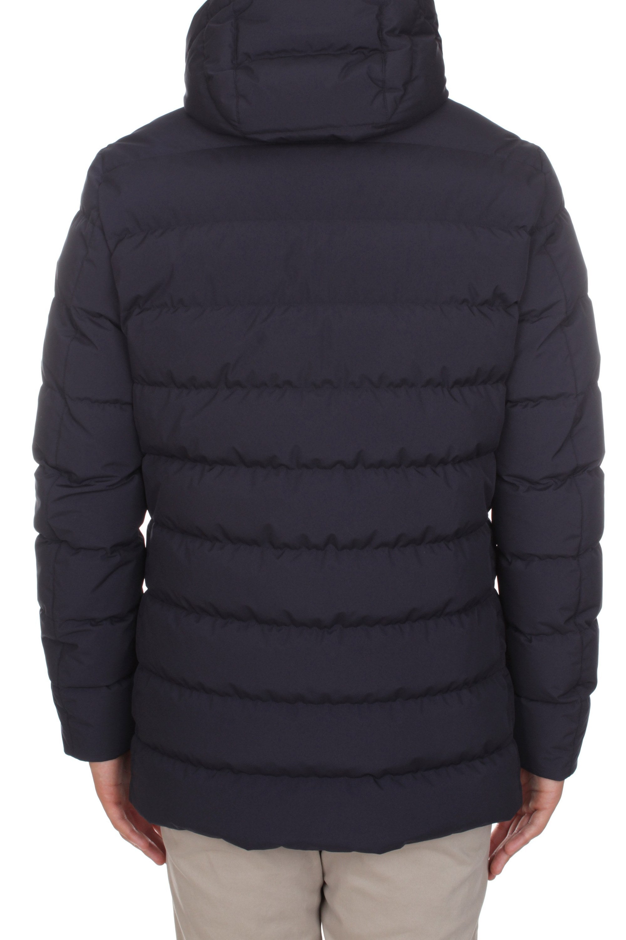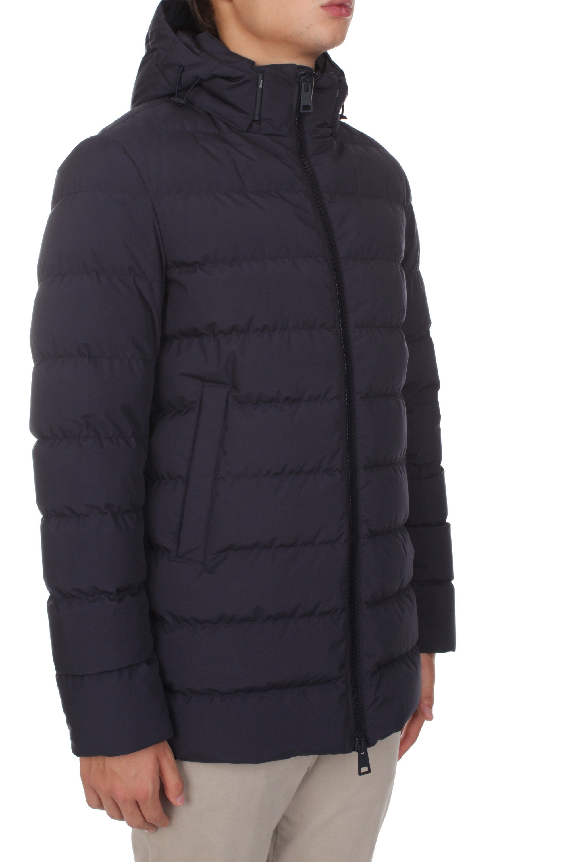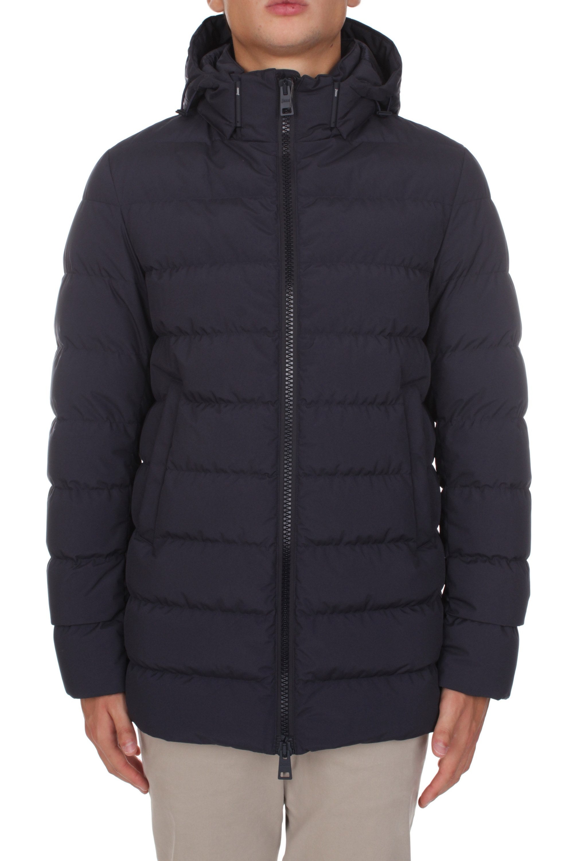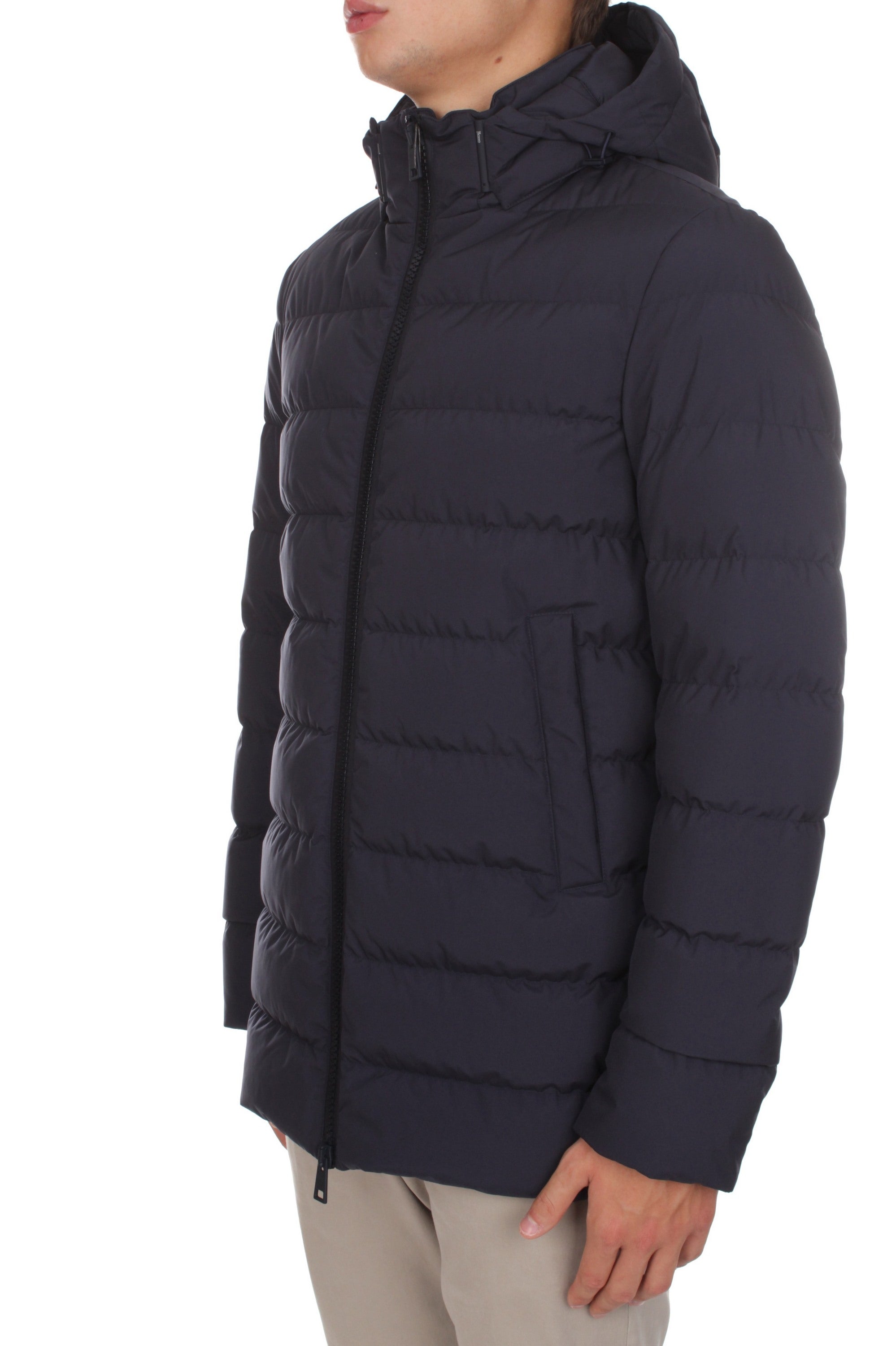 Herno down jacket is made of 100% polyester with Pro-Meteo technology and features goose down insulation, double slider zip closure, two side pockets with snap button closure and detachable hood. Regular fit. Model is 180 cm tall and wears size 48.