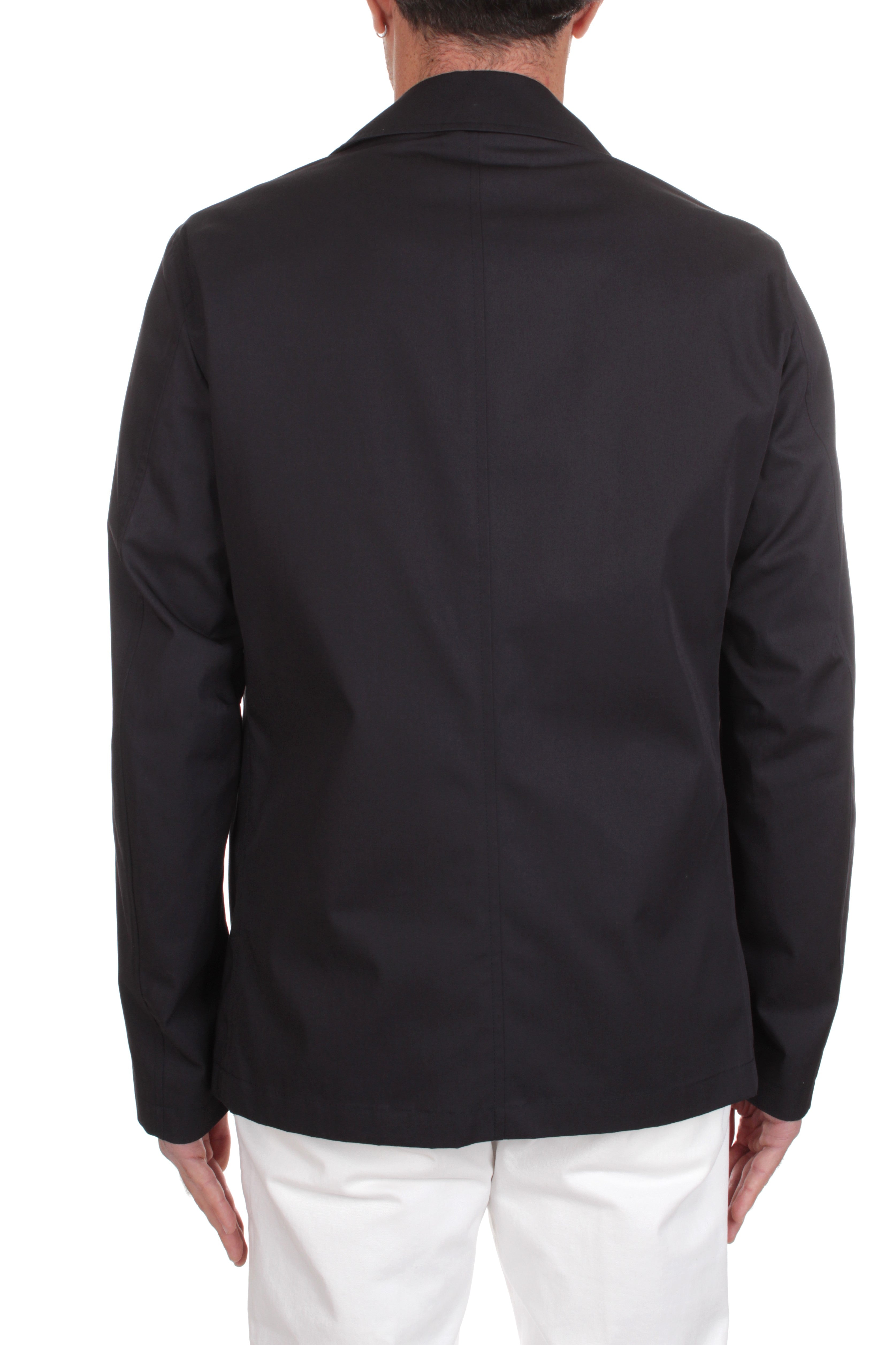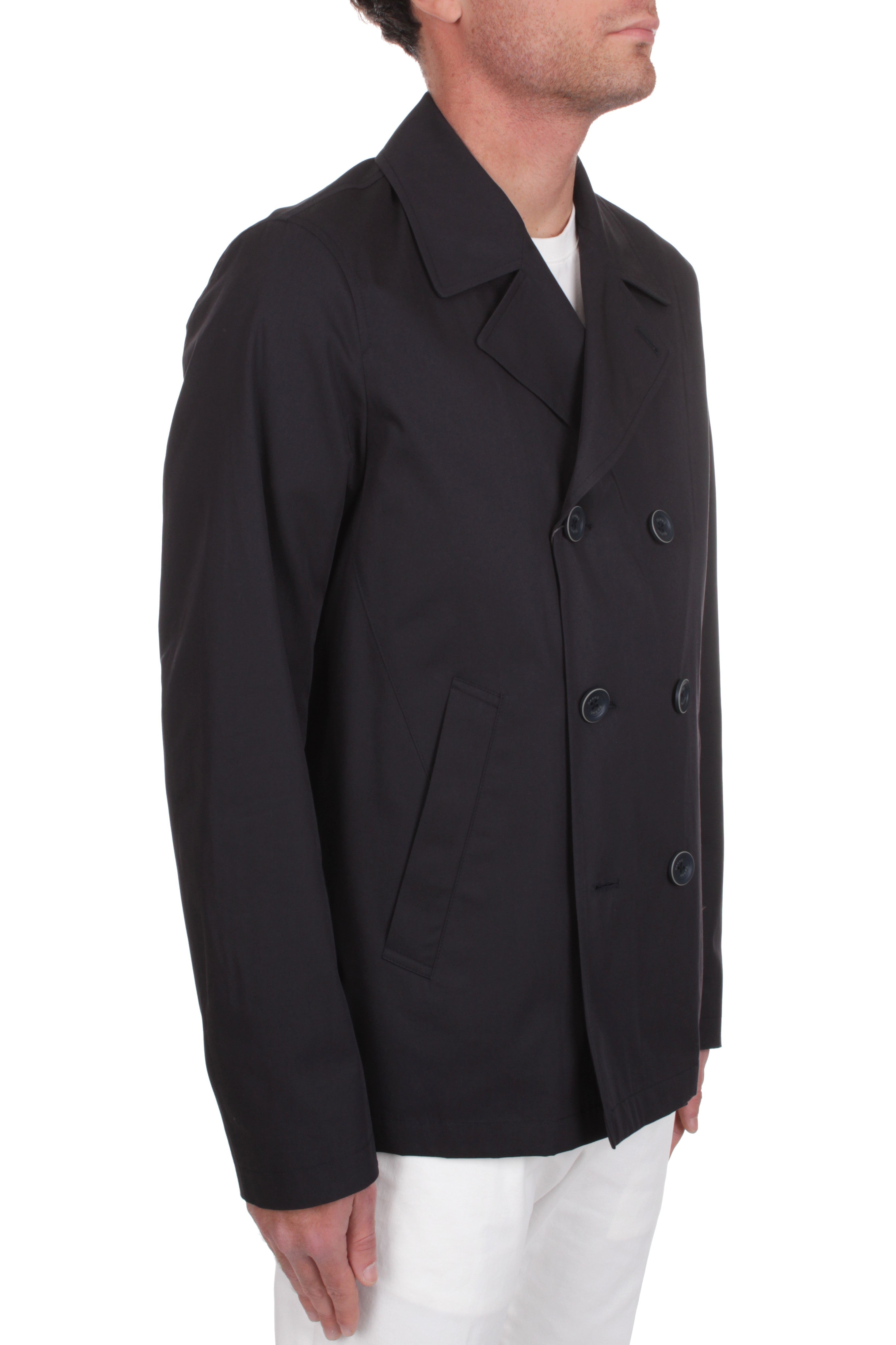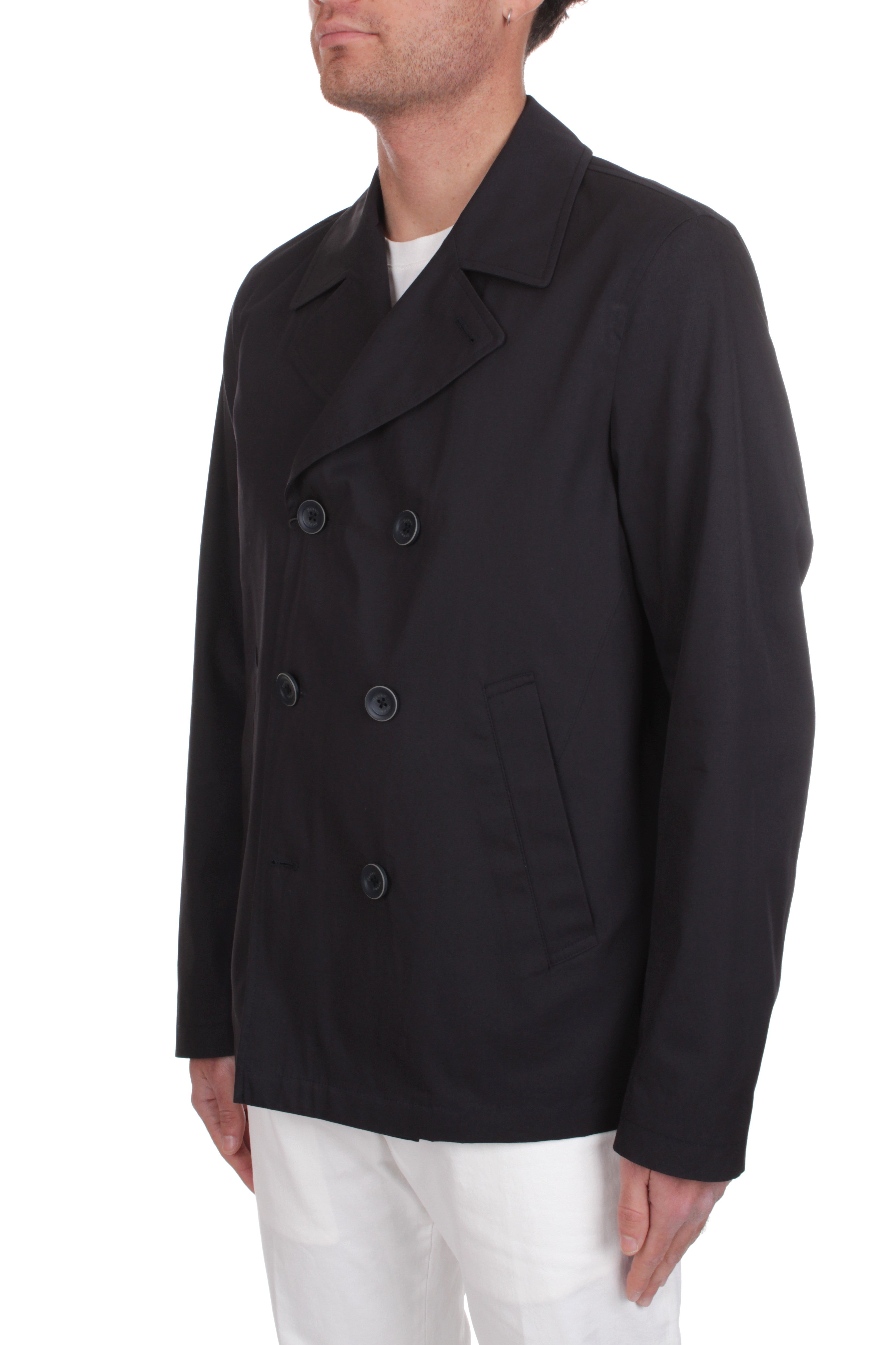 Herno Dean double-breasted lightweight jacket is made of 100% cotton and features two side welt pockets. Slim fit. Model is 180 cm tall and wears size 48.